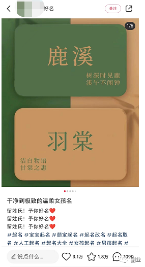 特别是账号打的标签,很值得借鉴。在小红书上做宝宝取名这个副业,确实操作简单,一个内容直接同步到某音和快手还有视频号!只要人设打造好,后端服务做好变现不会差! ![]()