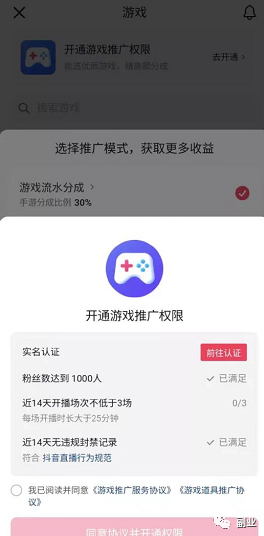 这里需要准备3-5个某音号,当然账号越多越好,其中一个作为开播账号,实名、千粉必不可少,确保能够开直播就行,通过直播来推广小游戏!这里最重要一个就是开通小游戏推广权限,满足4个条件就可以开通的