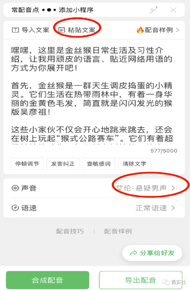 有了原创文案,下一步就是配音。你可以自己配音,也可以利用工具配音。如下: