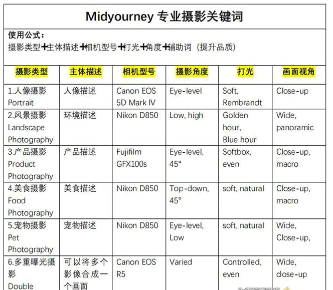 摄影类型+主体描述+相机型号+打光+角度+辅助词(提升品质)