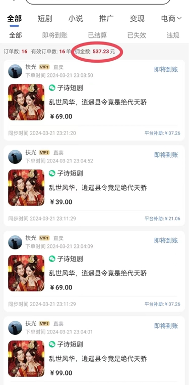 为什么短剧那么火,因为我们做的爽剧,就比如需道总裁爱上我,王子变青蛙,嫁入豪门,屌丝逆砻这些,这类短剧有一个共同点,就是能够抓住人的眼球,因为我们发布的都是不完整的视频,你看完一集就想看第二集,然后冲动消费,进行付费充值看全集,我们从而赚取客户充值的一个提成。金额从9.9—365不等,我们从中获取50%-70%的佣金,这个比例后面也会提高。