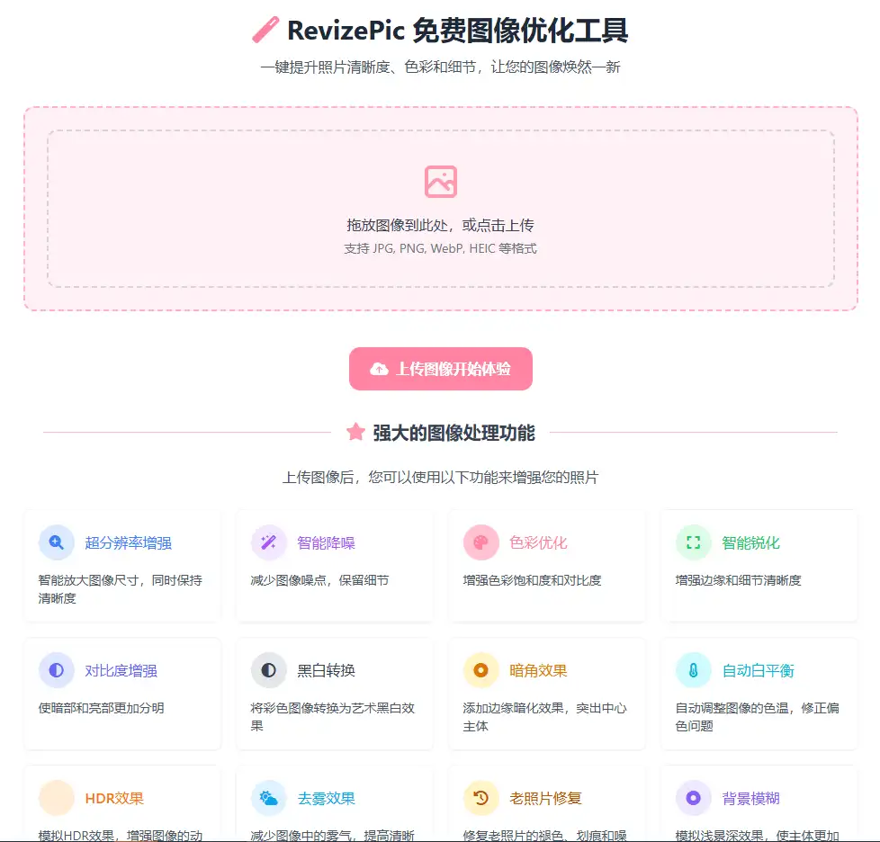 一款强大而简单的在线图像优化工具 ——RevizePic。它内置了 16 款 AI 功能,专为提升您的照片质量而设计。无论您是想修复老照片、增强手机拍摄的图像,还是改善扫描文档的清晰度,RevizePic 都能帮助您轻松实现。此款工具免费且不需要登录,即可对图像进行一键处理,非常的强大!绝对值得收藏。