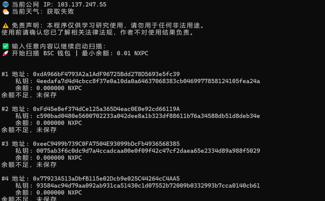 本脚本通过节点碰撞筛选出有余额的钱包,最少0.01nxpc